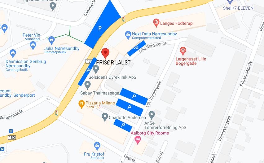 -30 min. parkeringsbås ude på vejen ved salonen. -2 timers parkering på pladsen lige overfor salonen ved krydset. -Masser af parkeringspladser uden tidsbegrænsning døgnet rundt, på p-pladserne omme bag ved salonen (Lille Borgegade).